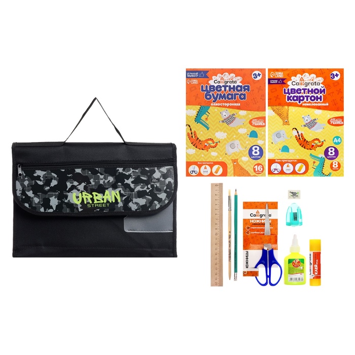 Папка для труда А4, 330 х 230, с ручками текстиль, раскладная на липучке, с наполнением 10 предметов, Calligrata, ПТР-10, "Камуфляж"