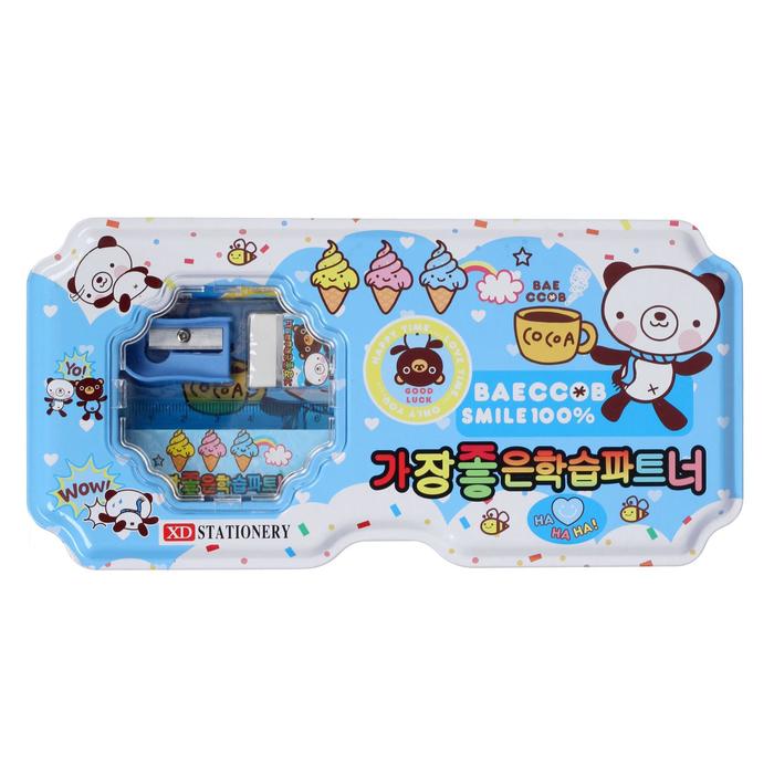 Пенал школьный металл «Мишки» (линейка, точилка, ластик, 2 карандаша), голубой