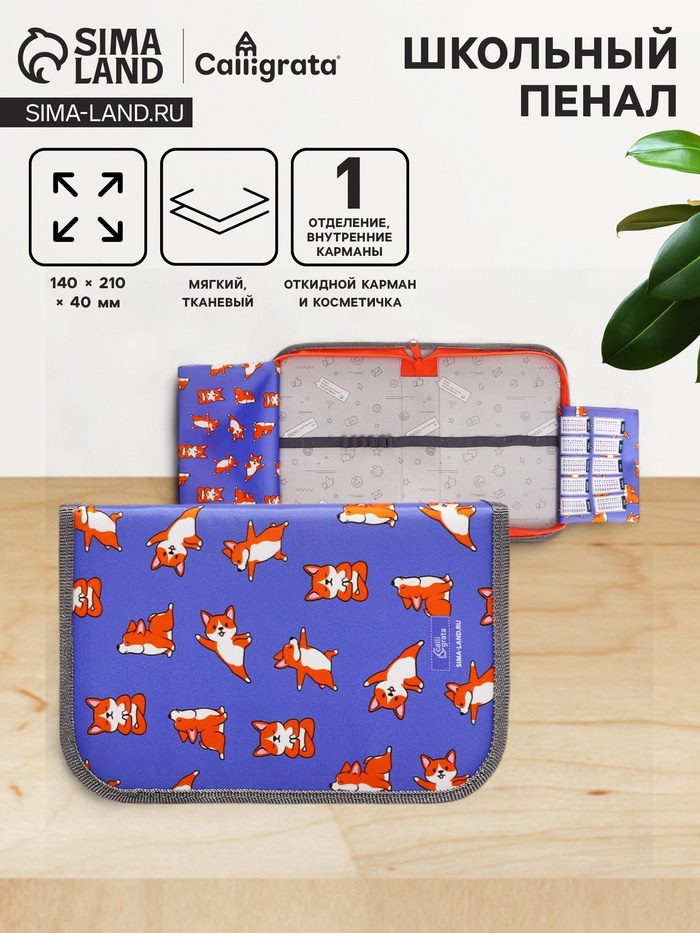 Пенал 1 секция 140×210×40 мм, откидной карман и косметичка, тканевый, «Сиба»