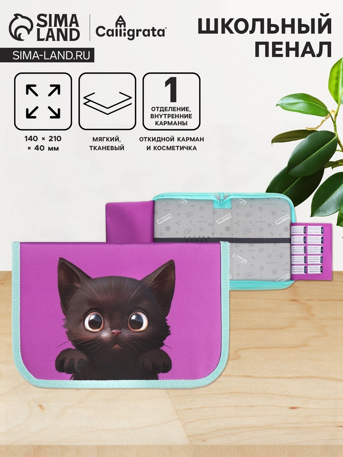 Пенал 1 секция «Котик в цветах» 140×210×40 мм, откидной карман и косметичка, тканевый