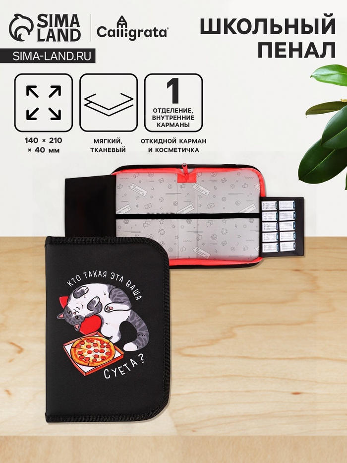 Пенал 1 секция 140×210×40 мм, откидной карман и косметичка, тканевый, «Кот суета»