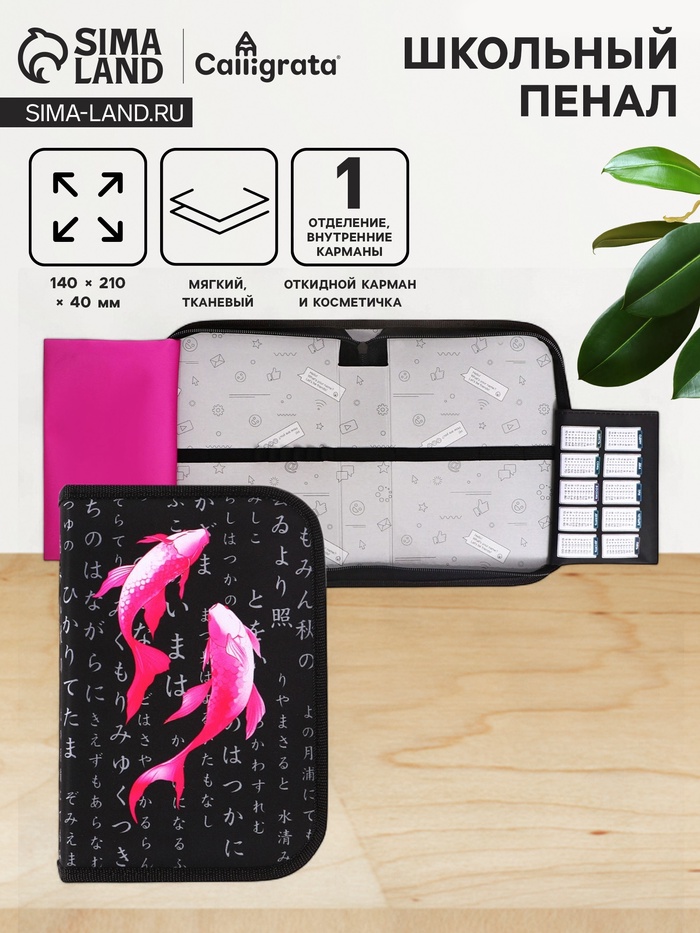 Пенал 1 секция 140×210×40 мм, откидной карман, косметичка, тканевый, «Рыбки»