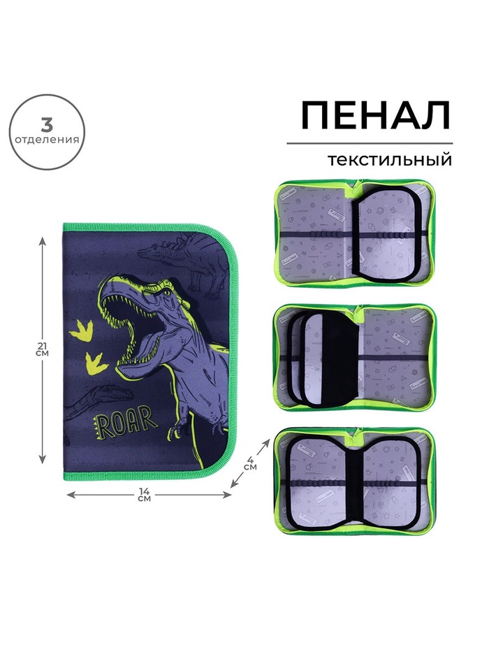 Пенал «Динозавр» 3 секции, вкладка внутри, 140×210×40 мм, тканевый