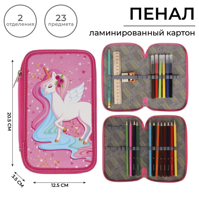 Пенал 2 секции, 125×205 мм, с наполнением 23 предмета, Calligrata «Единорог» ламинированный картон, 30П26/2/set