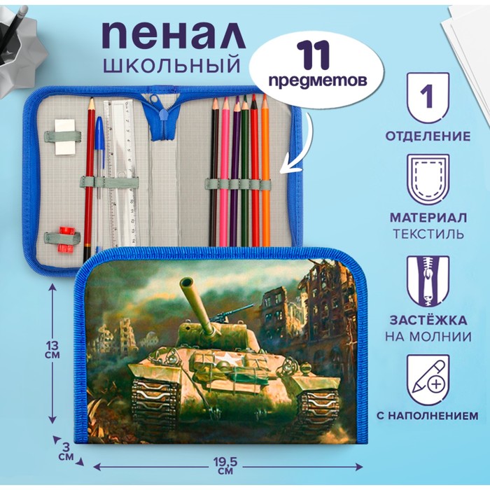 Пенал школьный «Танк», 13×19.5 см, на молнии, 1 секция, с наполнением 11 предметов, ткань
