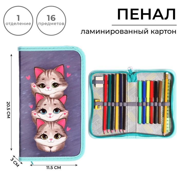 Пенал 1 секция, 115 х 205 мм, с наполнением 16 предметов, Calligrata "Котики" ламинированный картон, 30П26/set
