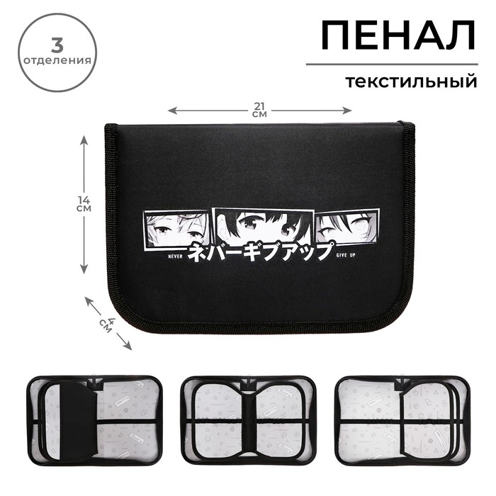 Пенал 3 секции, вкладка внутри, 140×210×40 мм, тканевый, «Аниме глаза»