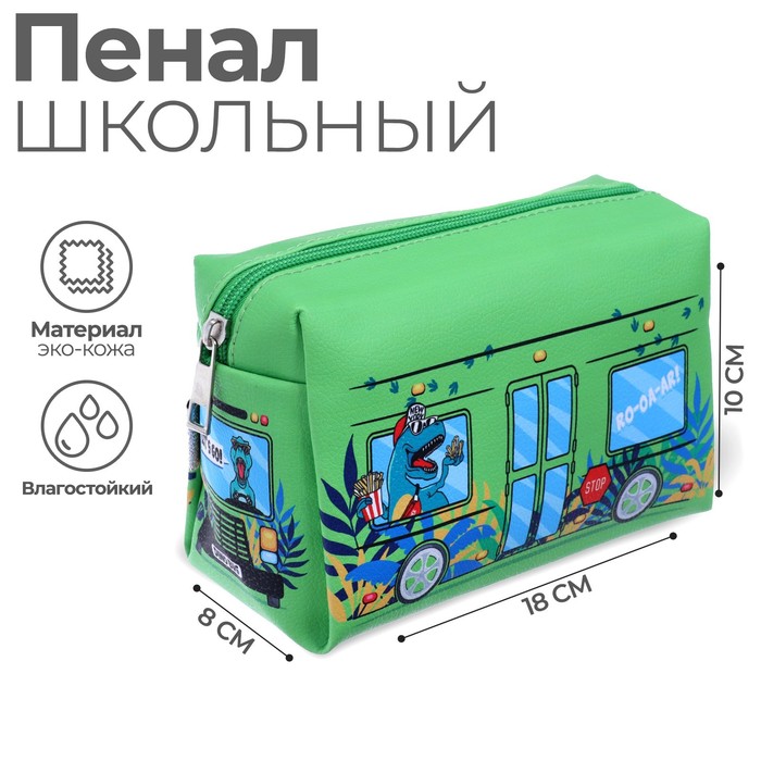 Пенал мягкий, 1 отделение, 100 х 180 х 80 мм, объёмный "Автобус с динозавриками" зелёный