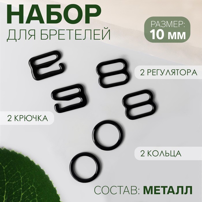 Набор для бретелей металлический: крючки, кольца, регуляторы, 10 мм, чёрный