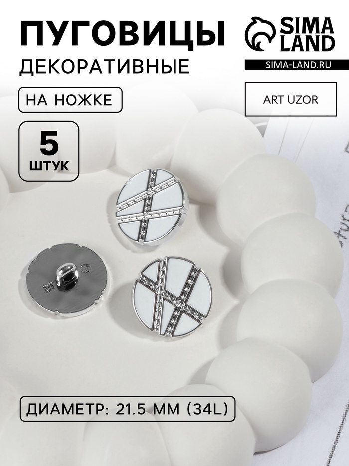 Пуговицы на ножке, d=21.5 мм, набор 5 шт., цвет белый, серебряный