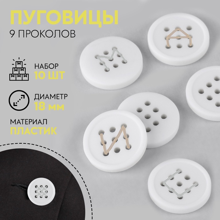 Набор пуговиц, 9 проколов, d=18 мм, 10 шт., белый