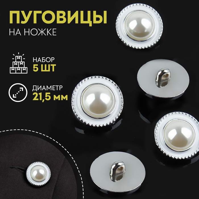 Набор пуговиц на ножке, d = 21,5 мм, 5 шт, цвет жемчужный/серебряный