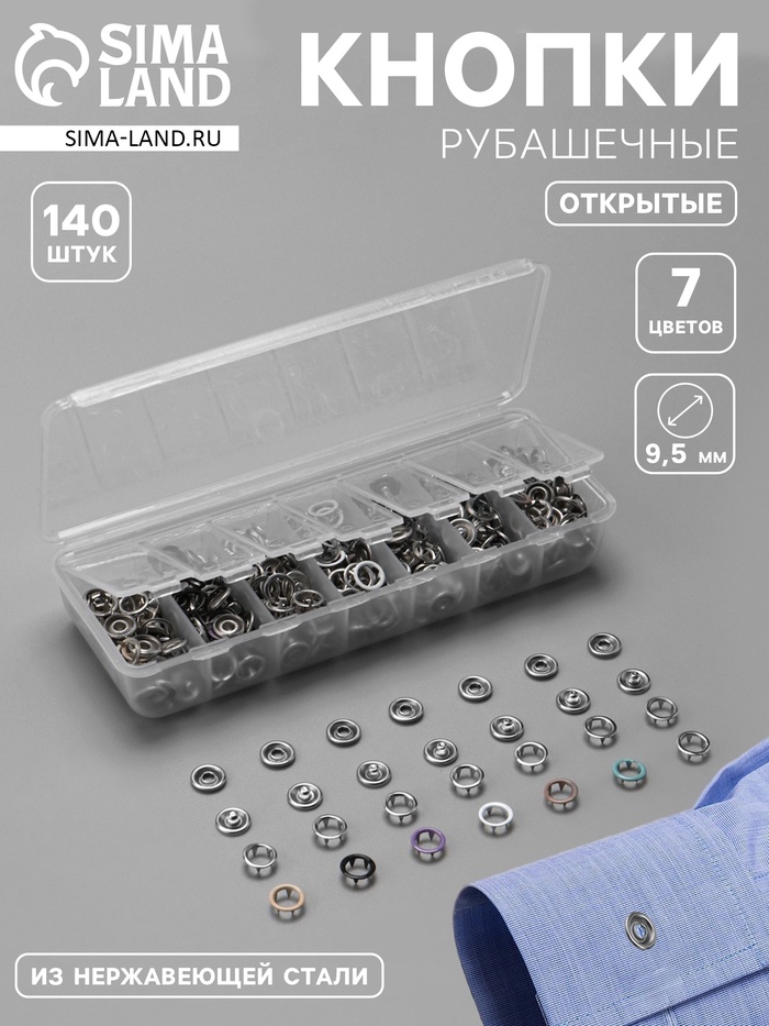 Кнопки рубашечные, открытые, d=9.5 мм, 140 шт., в органайзере
