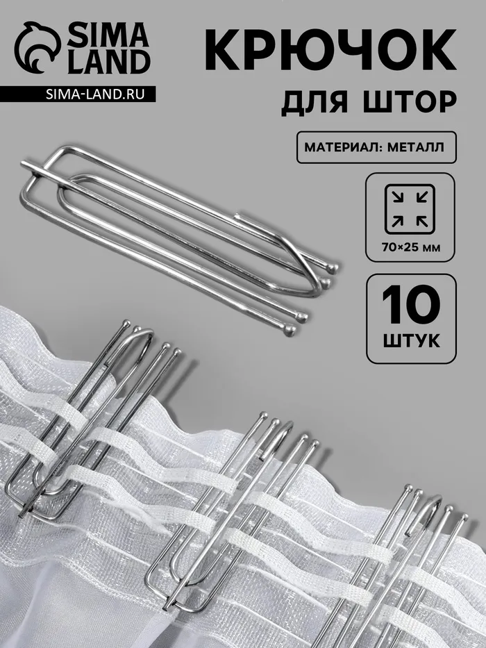 Крючок для штор, 70×25 мм, 10 шт., цвет серебряный