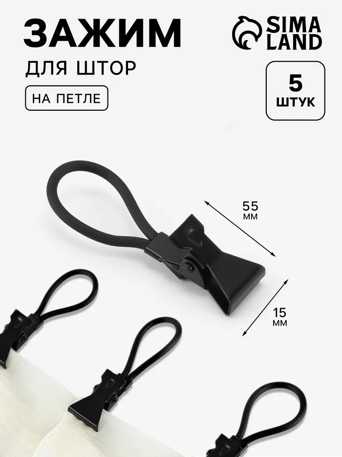 Зажим для штор на петле, металлический, 5.5×1.5 см, 5 шт., чёрный