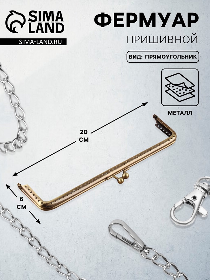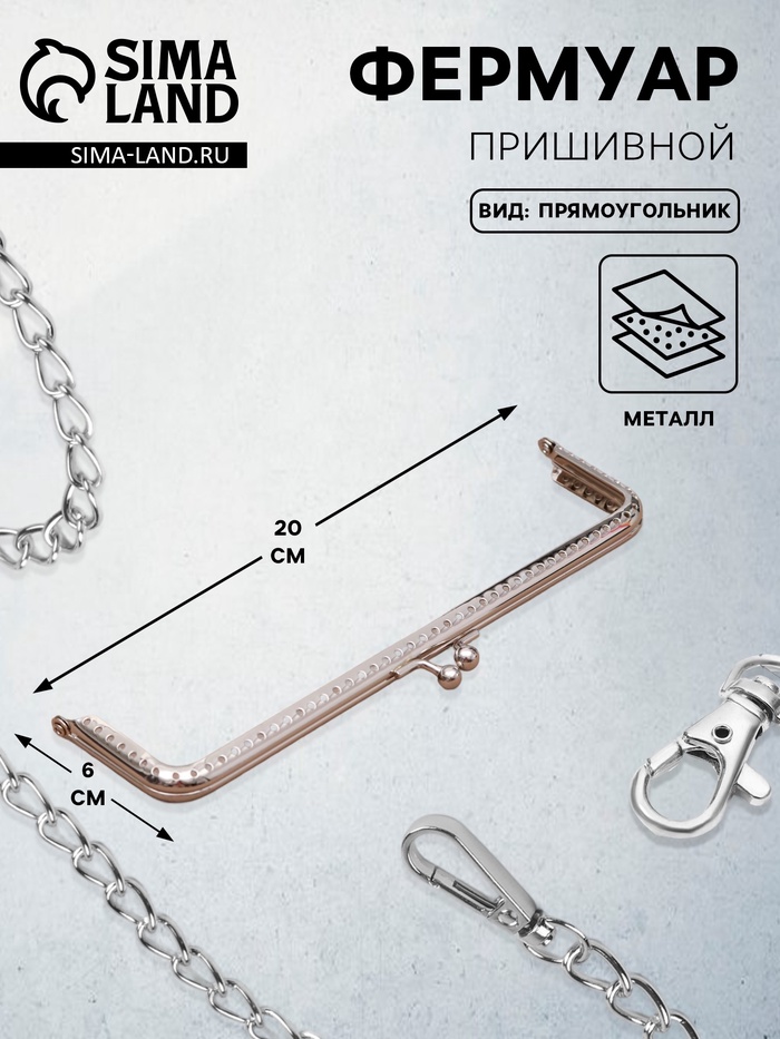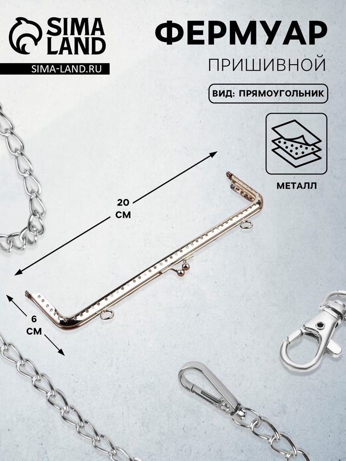 Фермуар пришивной «Прямоугольник», с креплениями, 20×6 см, цвет серебряный