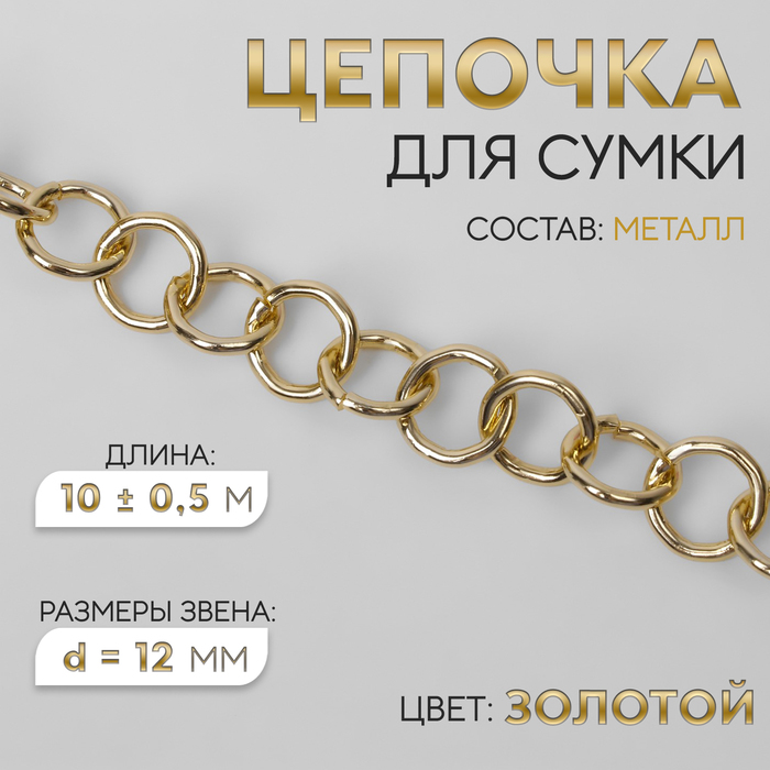 Цепочка для сумки, металлическая, d=12 мм, 10±0.5 м, цвет золотой