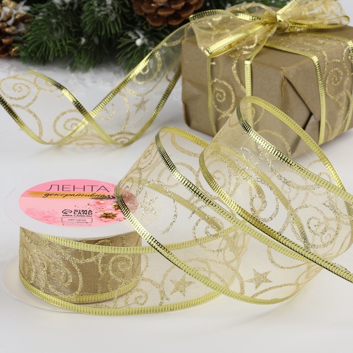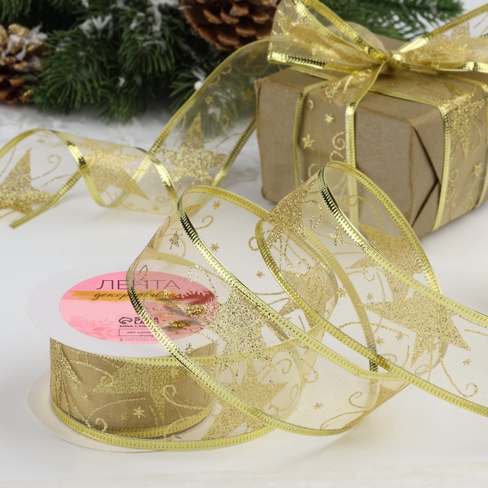 Лента капроновая с металлической нитью «Звёзды и вьюнки», 38 мм, 2.7±0.5 м, цвет золотой