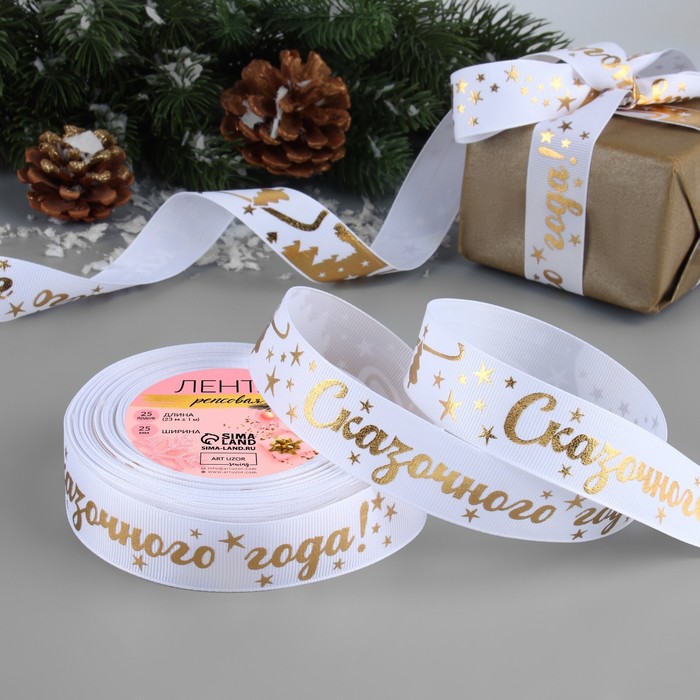Лента репсовая с тиснением «Сказочного года!», 25 мм, 23±1 м, белая, золотая №001