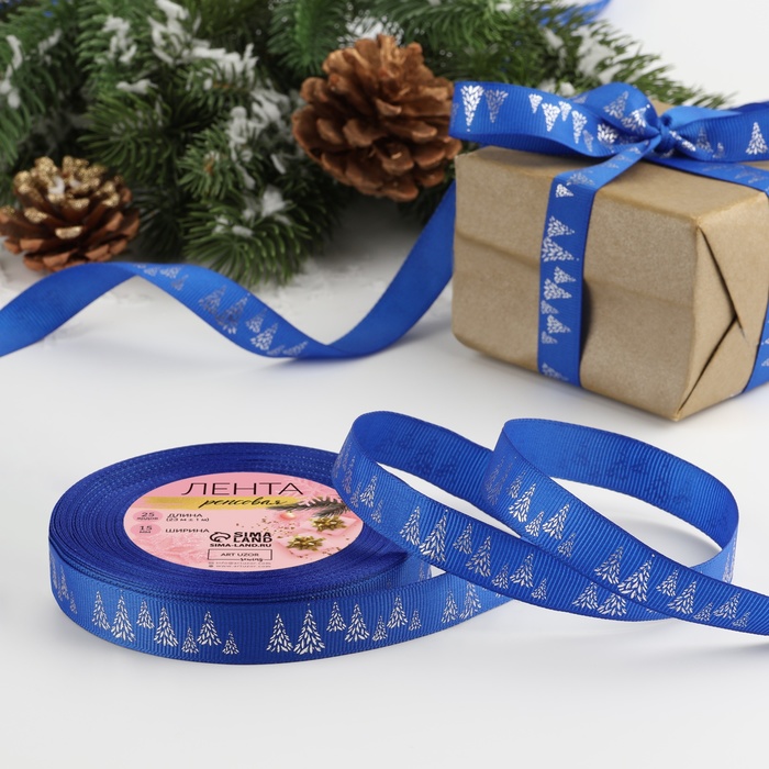 Лента репсовая с тиснением «Ёлки», 15 мм, 23±1 м, синяя, серебрянная №0055