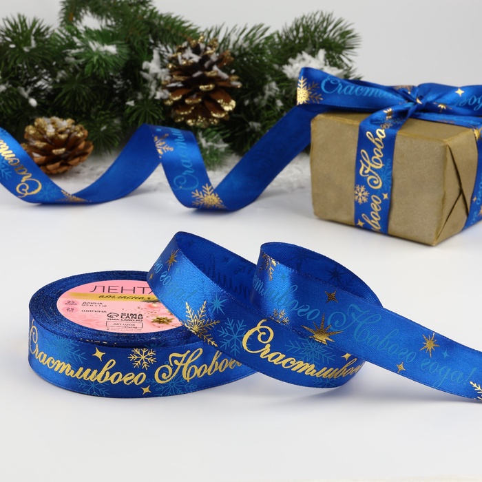 Лента атласная с тиснением «Счастливого Нового года!», 25 мм, 23±1 м, синяя