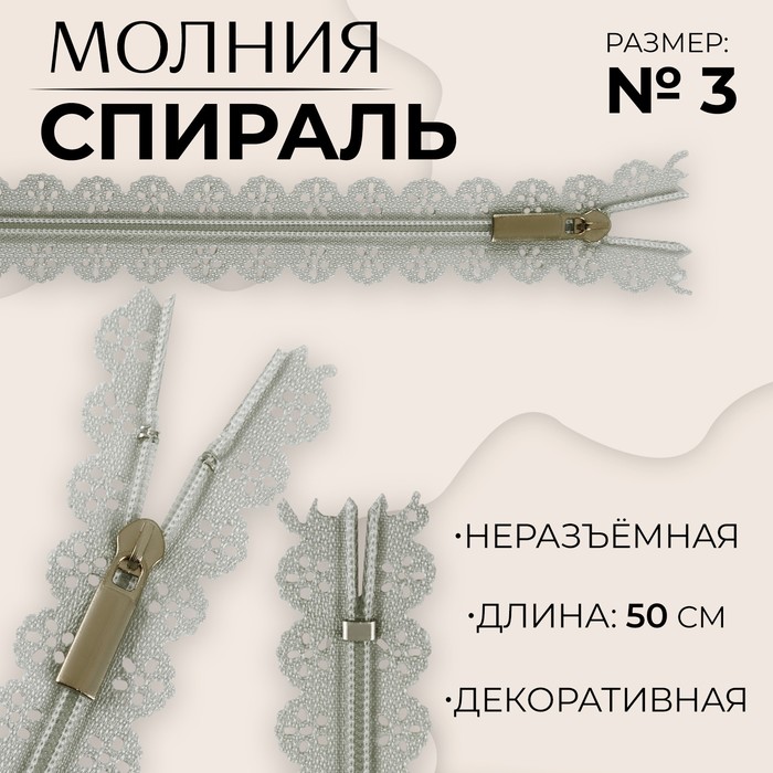 Молния «Спираль», №3, неразъёмная, ажурная, замок автомат, 50 см, серая
