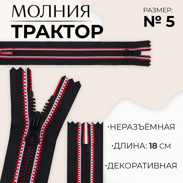 Молния «Трактор», №5, неразъёмная, замок автомат, 18 см, чёрная, красная, белая