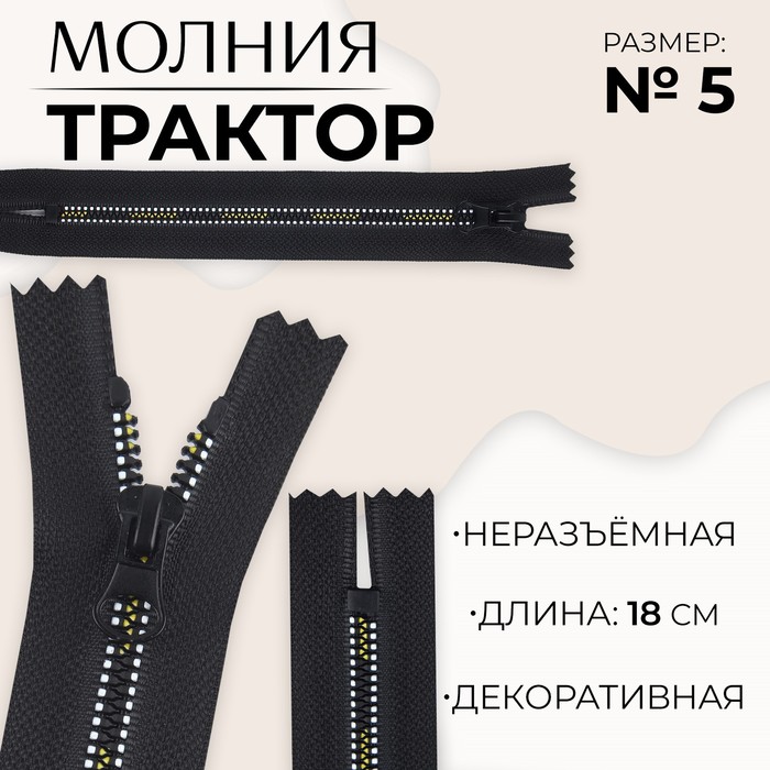 Молния «Трактор», №5, неразъёмная, замок автомат, 18 см, чёрная, белая, жёлтая