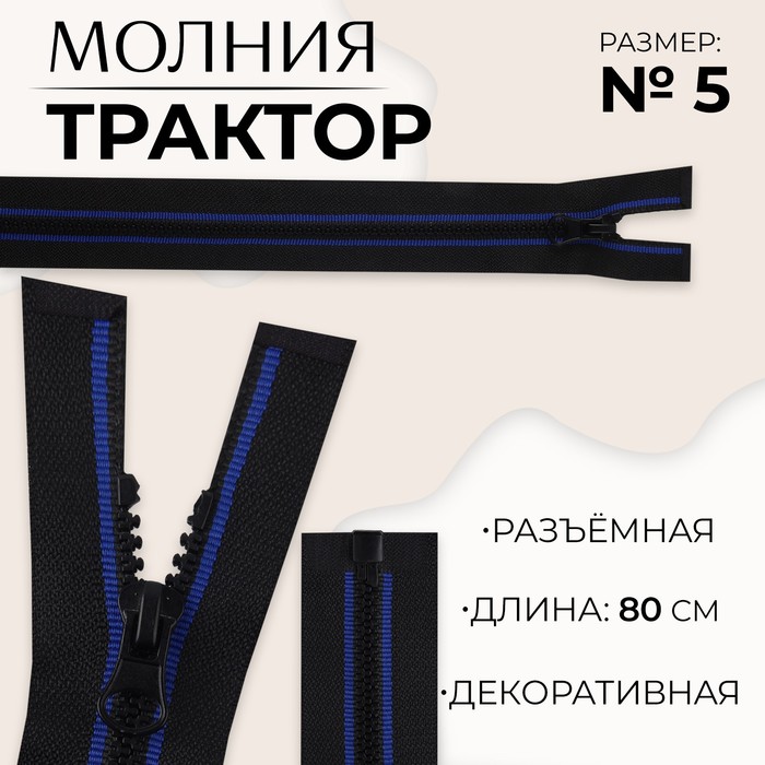 Молния «Трактор», №5, разъёмная, замок автомат, 80 см, чёрная, синяя
