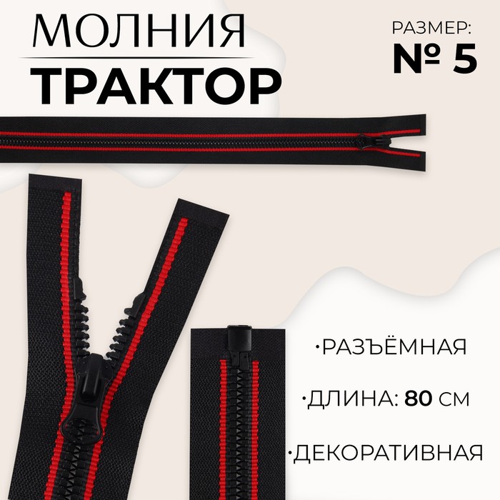 Молния «Трактор», №5, разъёмная, замок автомат, 80 см, чёрная, красная