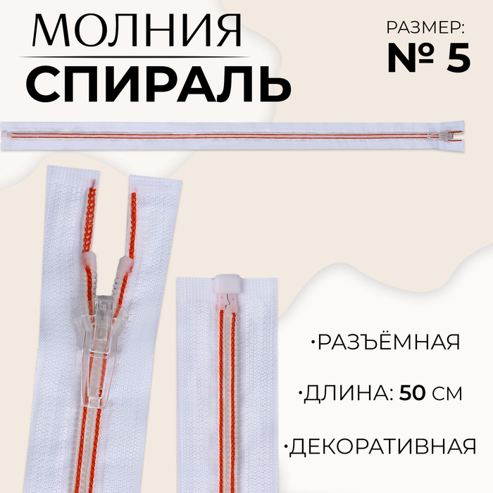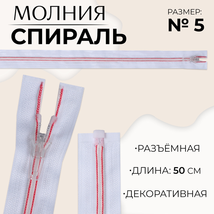 Молния «Спираль», №5, разъёмная, замок автомат, 50 см, белая, красная