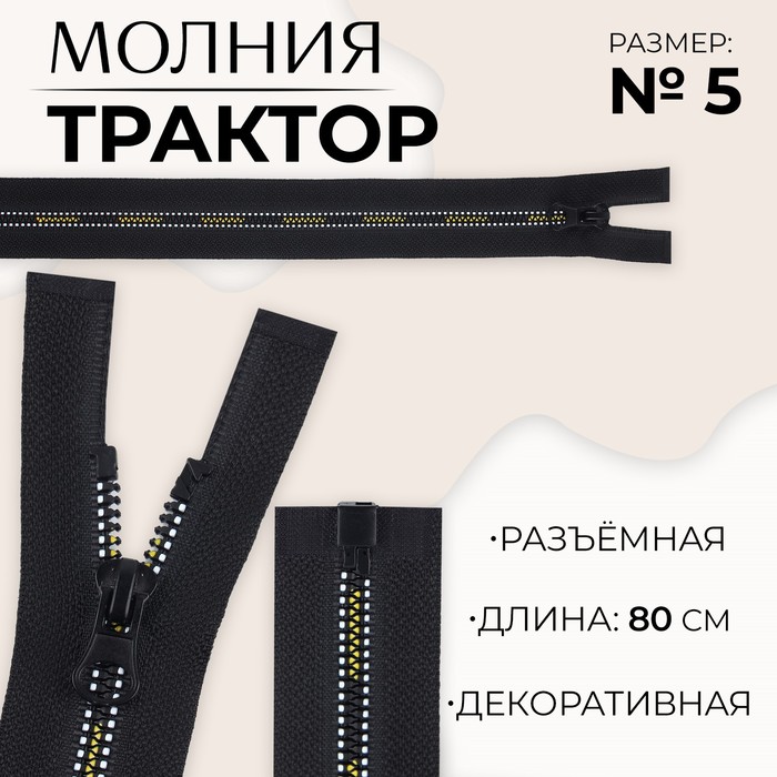 Молния «Трактор», №5, разъёмная, замок автомат, 80 см, чёрная, белая, жёлтая