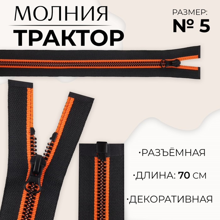 Молния «Трактор», №5, разъёмная, замок автомат, 70 см, чёрная, оранжевая