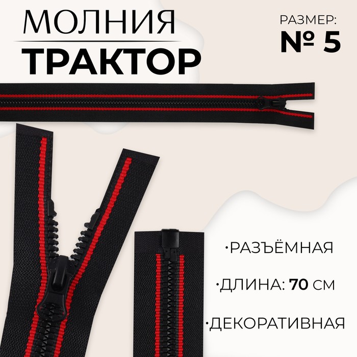 Молния «Трактор», №5, разъёмная, замок автомат, 70 см, чёрная, красная
