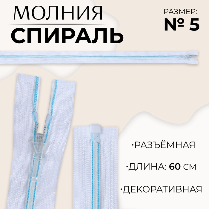 Молния «Спираль», №5, разъёмная, замок автомат, 60 см, белая, голубая