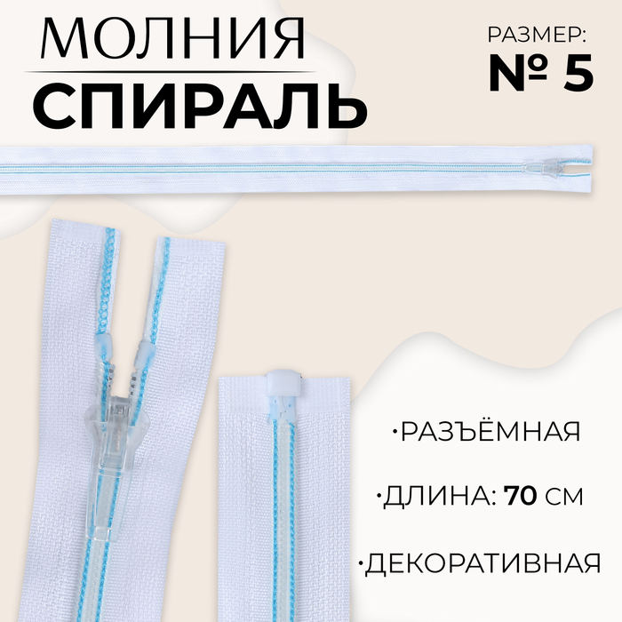 Молния «Спираль», №5, разъёмная, замок автомат, 70 см, белая, голубая