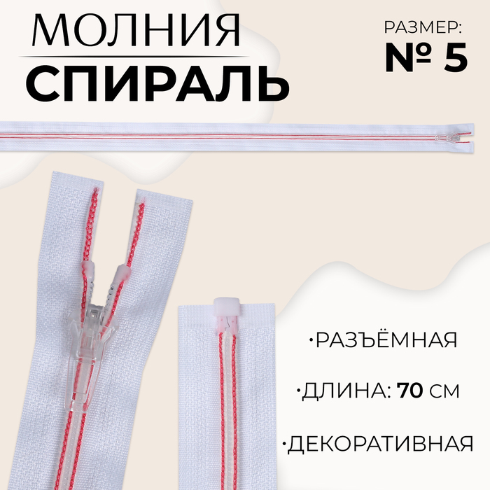 Молния «Спираль», №5, разъёмная, замок автомат, 70 см, белая, розовая
