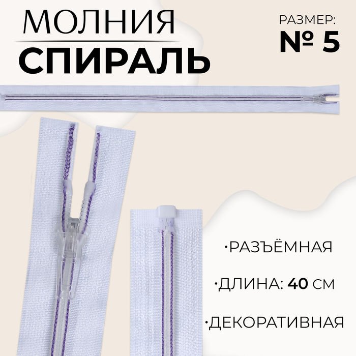 Молния «Спираль», №5, разъёмная, замок автомат, 40 см, белая, сиреневая