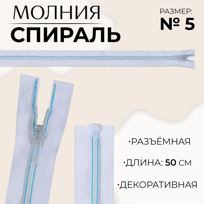 Молния «Спираль», №5, разъёмная, замок автомат, 50 см, белая, голубая