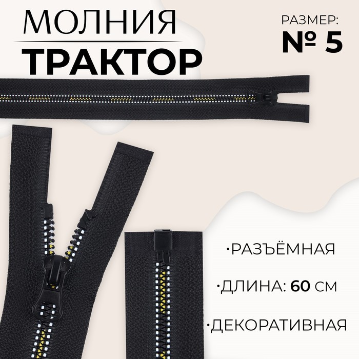 Молния «Трактор», №5, разъёмная, замок автомат, 60 см, чёрная, белая, жёлтая
