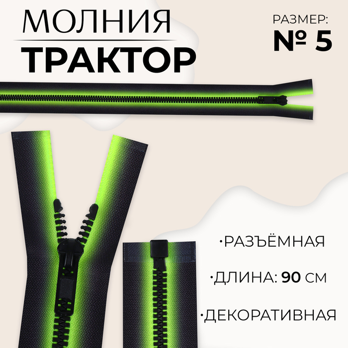 Молния «Трактор», №5, разъёмная, замок автомат, 90 см, зелёная, чёрная