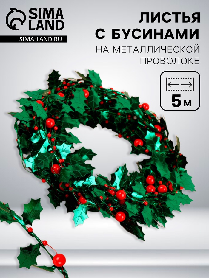 Листья на металлической проволоке, с бусинами, 21×18 мм, 5 м, зелёные, красные