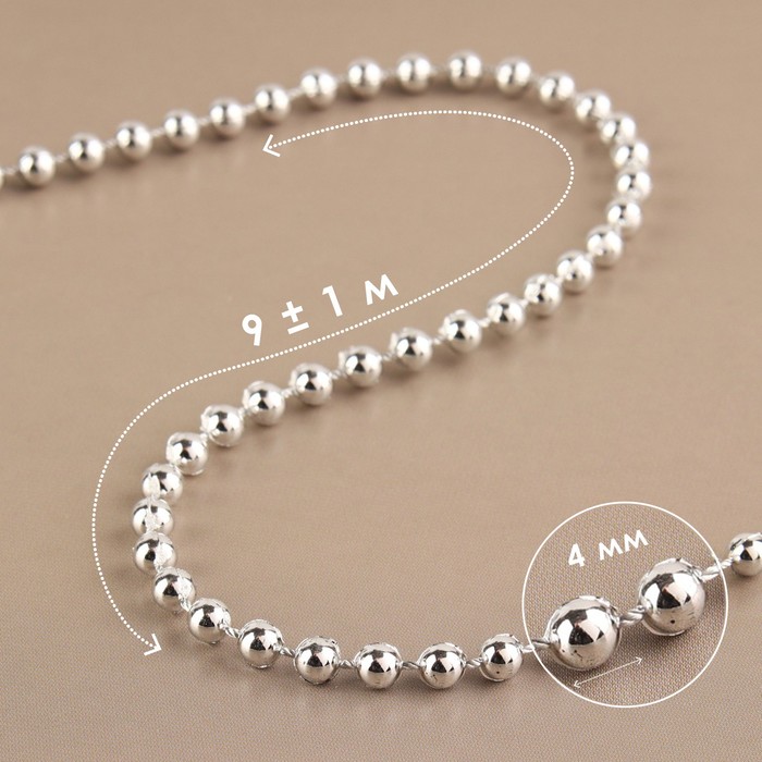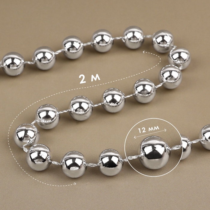 Бусины на нитях, круглые, 12 мм, 2 м, цвет серебряный