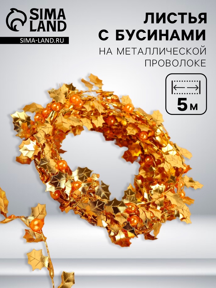 Листья на металлической проволоке, с бусинами, 21×18 мм, 5 м, цвет золотой
