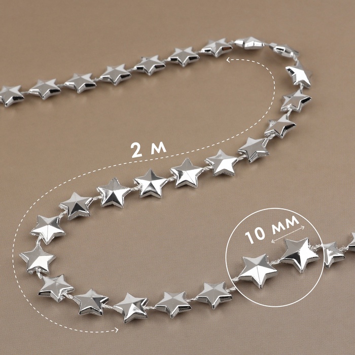 Бусины на нитях «Звёзды», 10 мм, 2 м, цвет серебряный