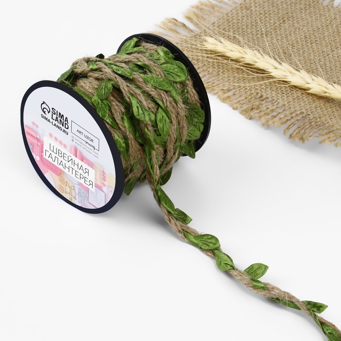 Тесьма декоративная холщовая «Листья», 25 мм, 9±0.5 м, бежевая, зелёная