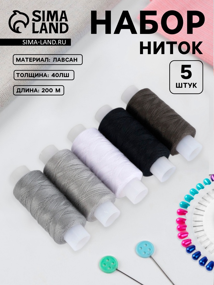 Набор ниток 40ЛШ, 200 м, 5 шт., чёрный, серый