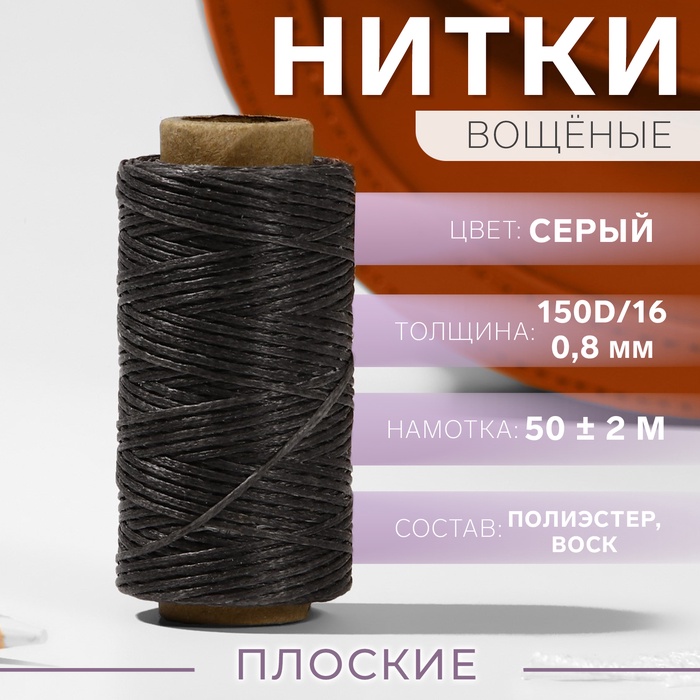 Нитки вощёные, плетёные, плоские, 150D/16, 0.8 мм, 50±2 м, тёмно-серые