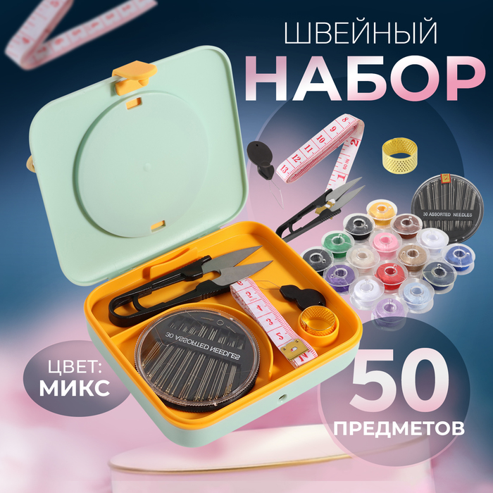 Швейный набор с лупой, 50 предметов, в двухъярусном боксе, 12×10.5×3 см, МИКС