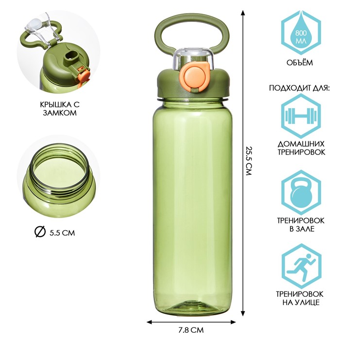 Бутылка для воды, 800 мл, SPORT, с поильником, зеленая